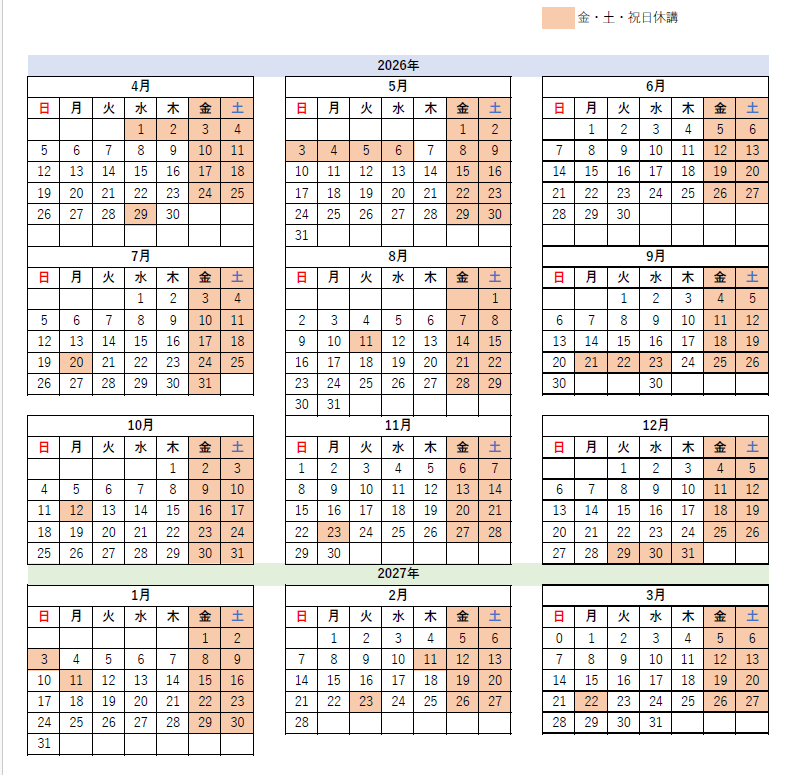 教室カレンダー 2022/1/6 赤枠の祝日、日曜日もお休みになります。ご注意ください。 冬季休講は12月29日~翌年1月3日 2026年4月から2027年3月まで 【移転に伴う休講期間】2026年3月29日(日)~4月4日(土)までお休みとさせていただきます。